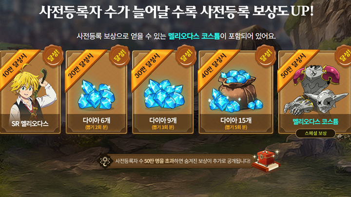 일곱 개의 대죄: 그랜드 크로스 사전예약 행사와 함께 달콤한 보상을 받을 수 있는 이벤트도 함께 진행중이다. 현재 사전 등록자 수 50만을 달성해 멜리오다스 코스튬 및 SR 멜리오다스, 다이아 30개를 받을 수 있다고 한다. 50만을 넘겼기에 숨겨진 보상도 받을 수 있을 예정이라고 한다. 또한 공식 카페에서 진행되는 이벤트를 참고해 추가 보상을 받을 수 있다고 하는데 사전예약 및 기타 자제한 사항은 이곳에서 확인할 수 있다.