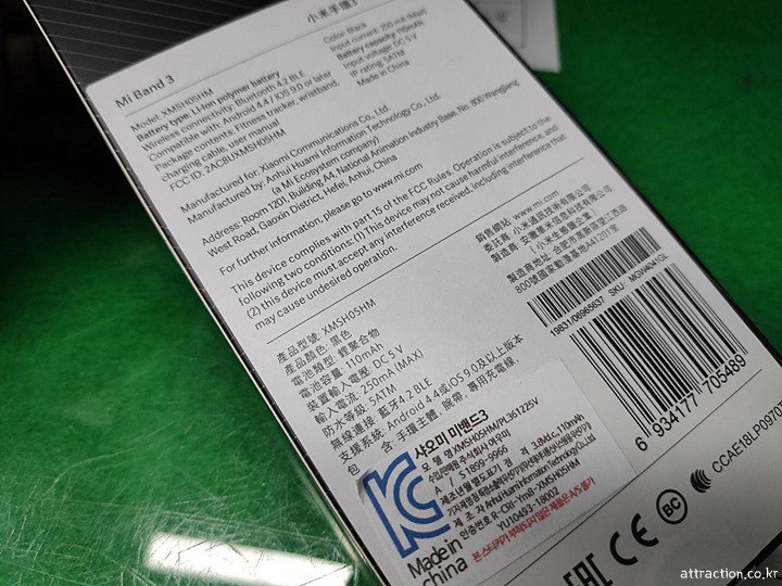 샤오미 미 밴드 3이라는 제품명이 인쇄된 상자에 본체와 기본 밴드 그리고 충전을 위한 케이블이 들어 있었다. 먼저 구매한 지인들의 정보로 스크래치 방지를 위한 필름과 스포츠 투톤 밴드를 추가로 구매했다. (추가금 7천원)