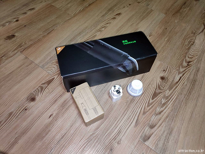 박스를 오픈하면 청소기 본체가 보이며 시거잭 타입 충전선과 구석구석 청소할 수 있는 연결 파츠가 있다. 제품 곳곳에 카본 무늬로 장식이 돼 있는데 5만 원 이하에서 이런 퀄리티를 샤오미 말곤 볼 수 없겠다는 생각을 들게 했다.