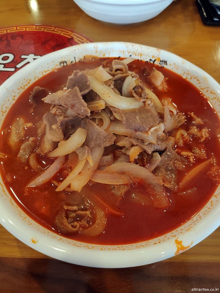 아무튼 고기 짬뽕은 처음이었는데 국물 색깔에 비해 일단 맵지 않았고 고기가 들어간 만큼 담백했다. 칼칼한 맛이나 매운맛이 사이사이 올라오는 그런 게 적어서 참 먹기가 편했는데 건더기로 들어간 고기 양이 장난이 아니었다. 면과 함께 고기를 막 흡입했음에도 불구하고 끝으로 갈수록 면은 없지만 고기는 있었다.