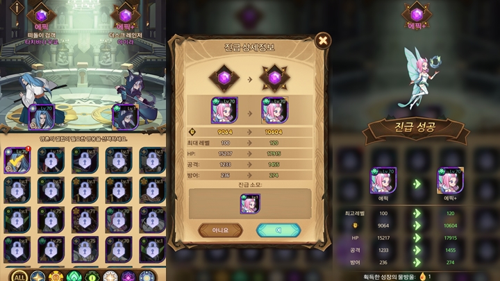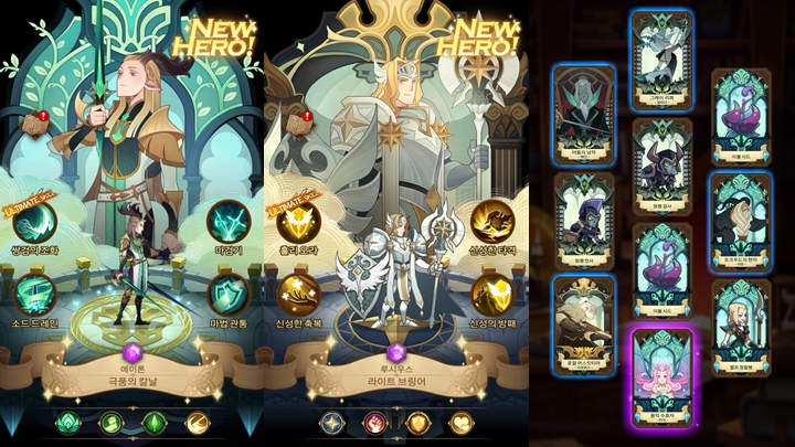 무려 240+레벨이라니 말이다. '캐릭터 하나 키우기 개 빡시겠네~'하는 생각을 자연스레 하게 될 것으로 생각한다. 덱을 구성하는 최소 요건은 상성도 있으나 일단 에픽 등급에 해당하는 영웅이 있어야 할 것으로 생각됐다. 에픽을 가지고 있더라도 태생이 귀하신 몸 출신이 아니면 스킬 구성에 차이가 나는데 그래서 아싸리 태생적으로 높은 등급의 영웅을 확보해야 한다. 각 영웅은 레벨업과 등급업, 장비 착용 및 강화를 통해 성장이 가능하다.