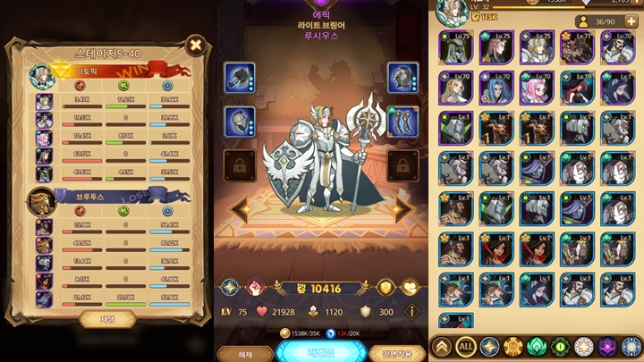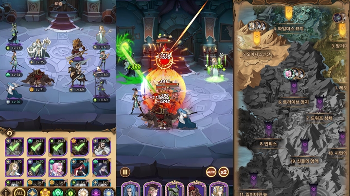 중심이라고 보이는 콘텐츠 요소는 다른 게임들과 비슷한 맥락으로 퀘스트, 인던, PVP다. 이런 콘텐츠를 잘 이용하려면 캐릭터의 멈추지 않는 성장이 뒷받침 되야한다. 그렇기에 AFK아레나의 진짜 메인 콘텐츠는 영웅을 잘 성장시키고 운영자가 내어 주는 숙제들을 조합을 바꿔가며 잘 풀어가는 게 아닌가 싶다.