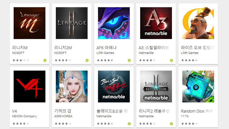 여하튼 구글 플레이 최고 매출 순위 모바일게임을 살펴봤는데 여전히 NC소프트사의 리니지M과 리니지2M이 번갈아 가며 선두를 지키고 있는 것으로 보였고 그 뒤를 이어 AFK아레나, A3: 스틸얼라이브, 라이즈 오브 킹덤즈, V4, 기적의 검, 블레이드&소울 레볼루션, 리니지2 레볼루션 그리고 Random Dice 순이었다.