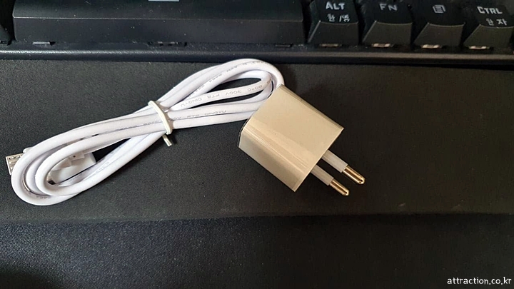 동봉된 악세사리는 본체 및 전원 케이블, 한국형 충전기와 사은품 열쇠고리로 구성돼 있었는데 한국형 충전기의 경우 콘센트에 결합해 사용하기엔 무리가 있었다. 굉장히 다리가 얇아서 콘센트 구멍엔 걸리지 않았다. 하지만 가지고 있던 해외 제품용 콘센트에서는 나름 결합이 되긴 했다. 하지만 여전히 헐거웠다.