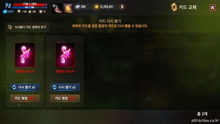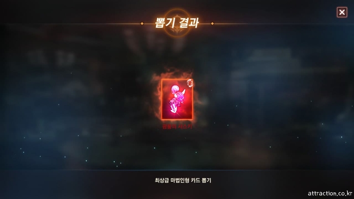 광풍의 샤스키 인형은 다른 옵션을 제외하고 MR +10을 올려주는 버프 효과가 있는데 이미 나이트 발드와 머미가 있는 관계로 영웅 인형을 본 것 자체가 반갑지만 뱀파이어를 가지고 싶다는 숙제가 계속되는 거 같아 조금 안타까웠다. 참고로 카드를 오픈한 시간은 일요일 새벽 4시다.