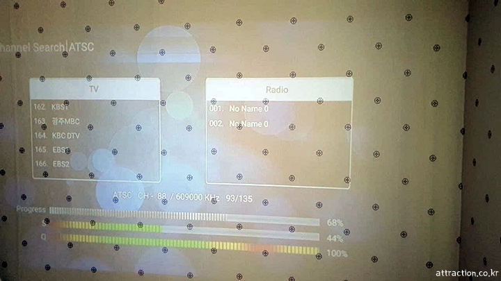 내용품은 본체, 리모컨, 인도어 안테나, HDMI케이블 그리고 설명서로 구성돼 있다. 내부용 안테나로 HD방송을 잡아보려 했는데 일단 전파만 잘 잡히면 공중파 티브이 시청도 할 수 있는 것으로 확인됐다. 벽면에 연결된 케이블을 본체와 연결하고 오토 스캔을 누르면 채널이 잡힌다. 쓸데없는 채널은 삭제도 가능하다.